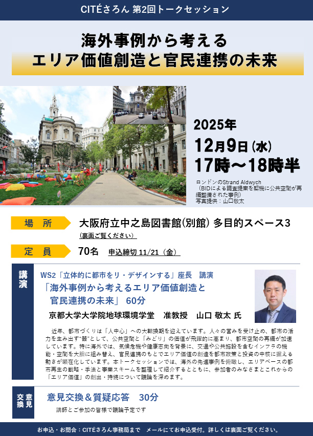 2022年度に引き続きCITÉさろんワークショップの座長を担当いたします。よろしくお願い致します。専門は交通工学・都市交通計画です。過去十数年にわたって、歩行者・自転車交通を中心にかかわりつつ、様々な海外都市における交通政策の調査研究を経験してきました。こういった経験をもとに、関西の都市について参加される皆さんと議論したいテーマは「交通関連施設の公共性」です。 2019年に発生した新型コロナウイルス感染症は、ライフスタイル、働き方、移動のあり方など、我々がこれまで当たり前としてきた価値観の前提条件を再考する機会となりました。また、パンデミック後の新しい生活様式では、様々な提案がなされていま