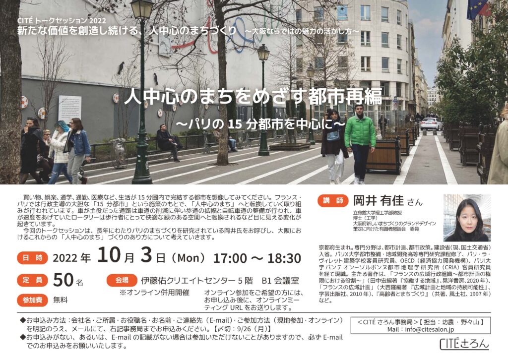 今回のトークセッションは、長年にわたりパリのまちづくりを研究されている岡井氏をお呼びし、大阪に