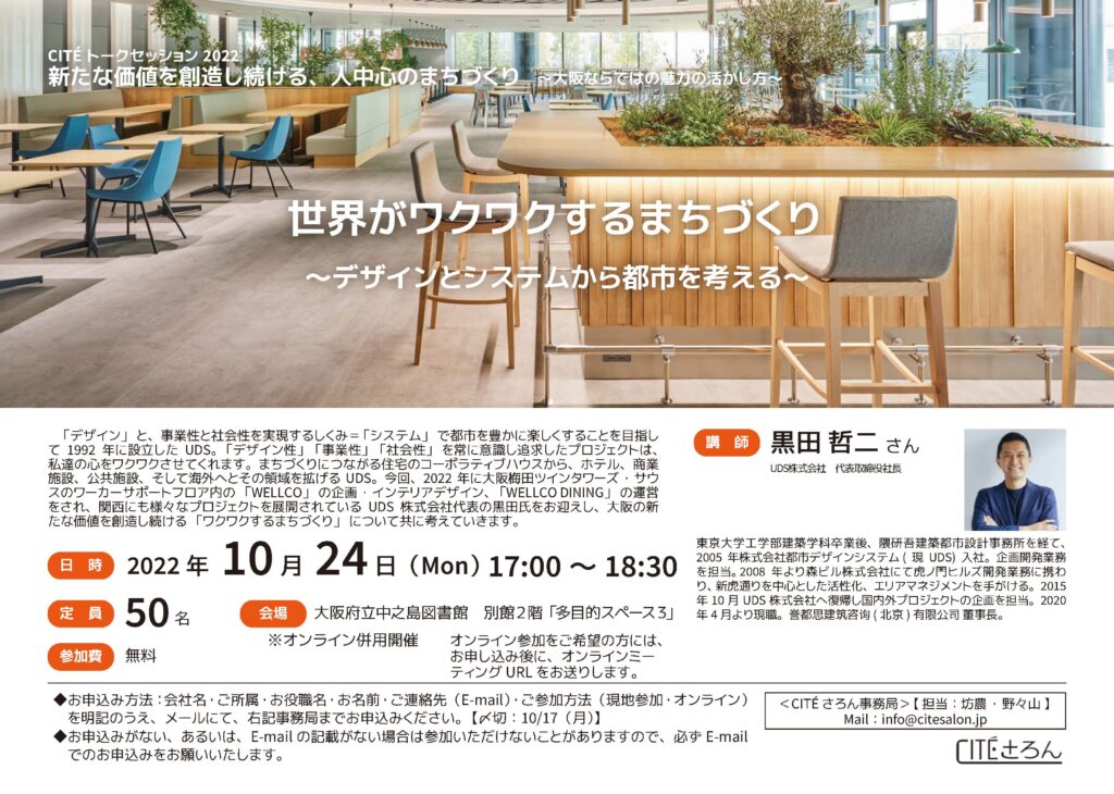 をされ、関西にも様々なプロジェクトを展開されているUDS 株式会社代表の黒田氏をお迎えし、大阪の新